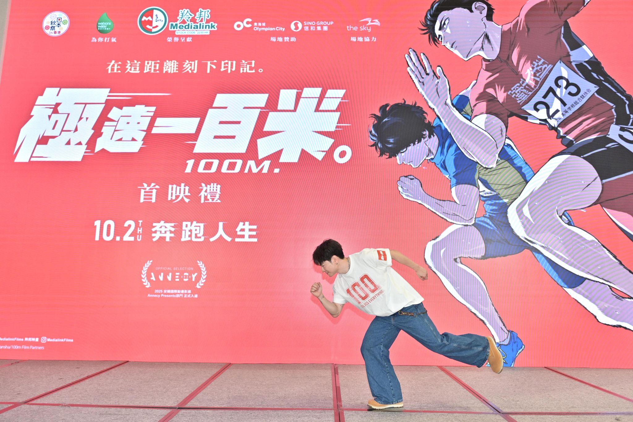 《極速一百米。》首映現場集結眾多香港精英運動員,見證這部運動傑作跑到來香港。香港精英運動員協會副會長倪文玲女士與香港田徑青年代表陳一樂與現場觀眾分享作為運動員發掘才能的時刻與體會。曾經是香港足球青年軍以及甲組球員的安仔,亦表示自己十分喜愛熱血的動漫,特別是運動類型,而足球就為自己帶來凡事全力以赴的運動員精神。及後安仔與主禮嘉賓一齊進行儀式,台上起跑喇叭鳴起一刻,象徵電影《極速一百米。》正式開跑。